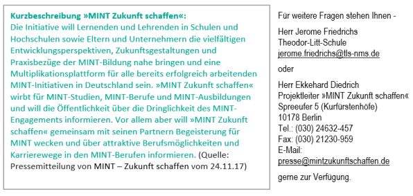Die »MINT-freundlichen Schulen« werden für Schülerinnen und Schüler, Eltern, Unternehmen sowie die Öffentlichkeit durch die Ehrung sichtbar und von der Wirtschaft nicht nur anerkannt, sondern auch besonders unterstützt. Bundesweite Partner der Initiative »MINT Zukunft schaffen« zeichnen in Abstimmung mit den Landesarbeitgebervereinigungen und den Bildungswerken der Wirtschaft diejenigen Schulen aus, die bewusst MINT-Schwerpunkte setzen. Die Schulen werden auf Basis eines anspruchsvollen, standardisierten Kriterienkatalogs bewertet und durchlaufen einen bundesweit einheitlichen Bewerbungsprozess. (Quelle: Pressemitteilung von MINT – Zukunft schaffen vom 24.11.17)