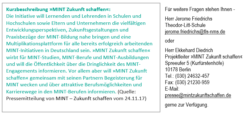 „Die Auszeichnung zur MINT-freundlichen Schule ist die Bestätigung der guten Arbeit, die in diesem Bereich von den Lehrkräften an der Theodor-Litt-Schule geleistet wird und betrifft neben dem Fachbereich Informatik auch den breit aufgestellten Bereich der Naturwissenschaften und das Fach Mathematik an der TLS.“, meint der Koordinator der MINT-Förderung an der TLS, Herr Jerome Friedrichs. Die Auszeichnung ermöglicht der Schule zukünftig auch den Zugang zu einem großen Netzwerk an Förderangeboten für MINT-freundliche Schulen, mit deren Hilfe das Angebot zukünftig noch weiter ausgebaut werden wird. Die Auszeichnung sei auch ein Vertrauensvorschuss und eröffne der Schule zahlreiche neue Möglichkeiten durch das MINT-Max Partnerprogramm, sagt Herr Friedrichs.