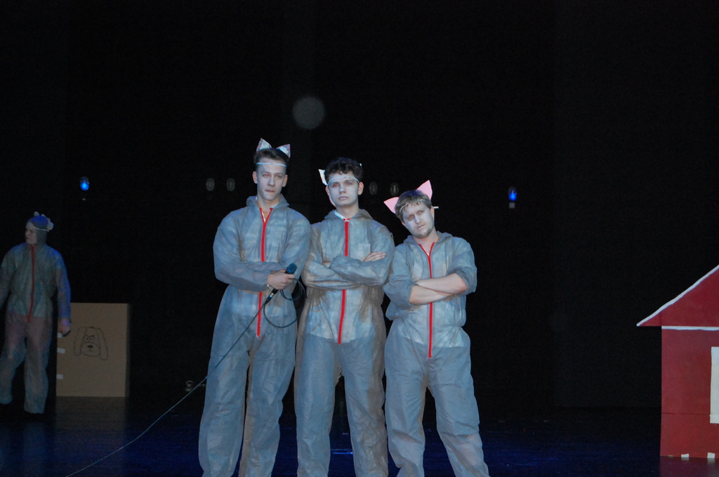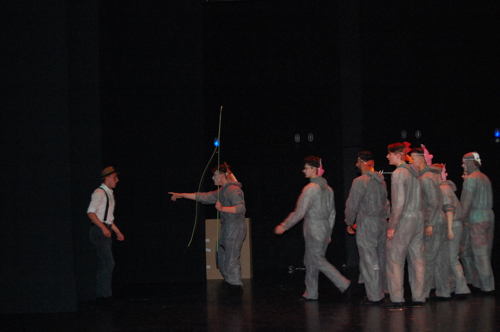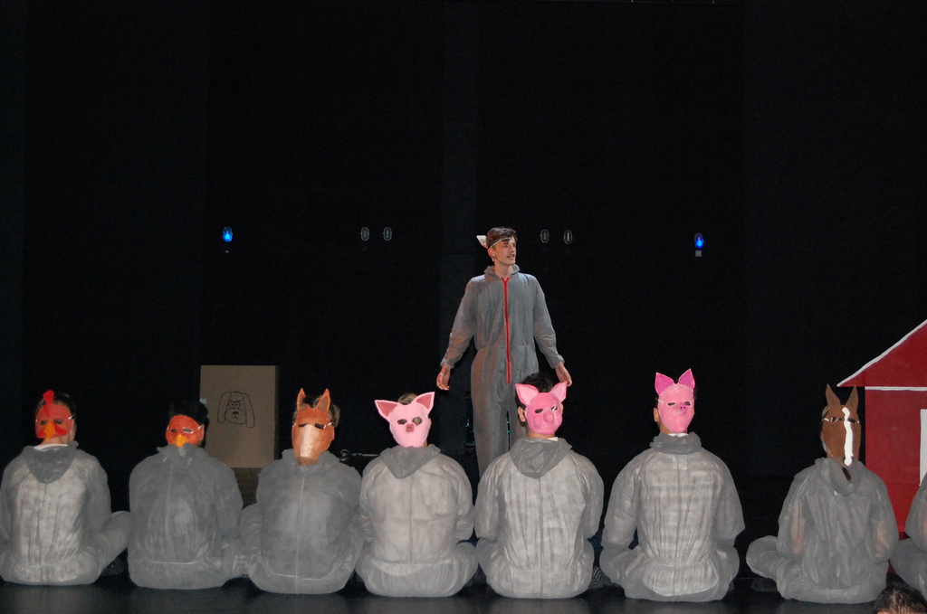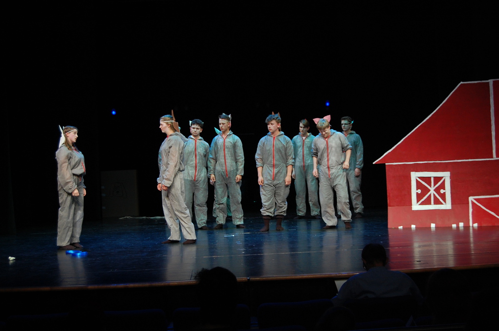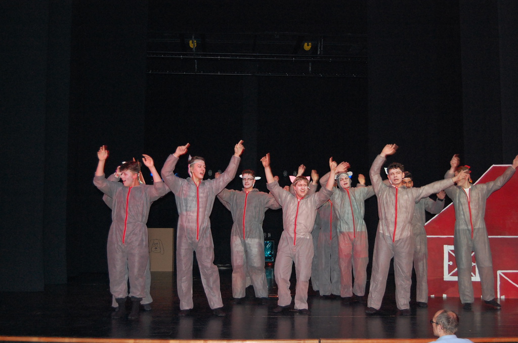 Am Abend des 28.05.18 war es wieder soweit: der Theater-Vorhang der Stadthalle Neumünster öffnete sich für die 17-köpfige Crew der BGB 17b unserer Schule für deren englischsprachige Darbietung von „Animal Farm“. Vor etwa 150 Zuschauern präsentierten die Schülerinnen und Schüler des 11. Jahrgangs eine auf den Punkt gelungene Performance des englischen Klassikers von George Orwell. In zeitmoderner Interpretation setzte das Ensemble die Fabel über Misshandlung, Ausbeutung, Revolution und Gleichheitsgedanke in kreativer Art und Weise um. Die musikalisch untermalte Auftaktszene, in der alle Schauspieler mit ihren selbst gestalteten Masken die Idee des Freiheitsgedankens gekonnt darstellten, zog sofort das gesamte Publikum in seinen Bann. Zu weiteren unterhaltsamen Schlüsselszenen, die von unseren zwei Erzählerinnen eingeleitet wurden, gehörten u.a. der selbstgeschriebene Rap-Song des Hauptdarstellers des Schweines Napoleons und die Tanzeinlage der selbstverliebten Stute Molly, - beide wurden mit kräftigem Zwischenapplaus belohnt. Highlights waren auch die bühnenreif dargestellte Trunksucht von Farmer Jones sowie die schattenhaft inszenierte Kampfszene zwischen rebellierenden Tieren und den herrschsüchtigen Menschen.