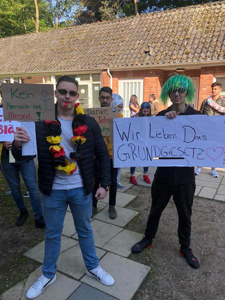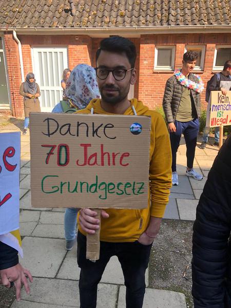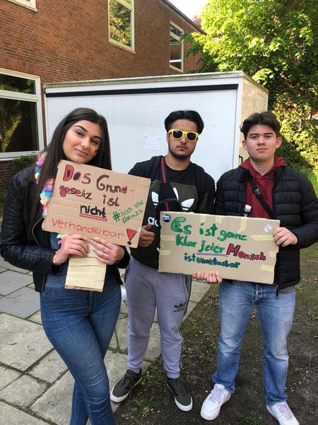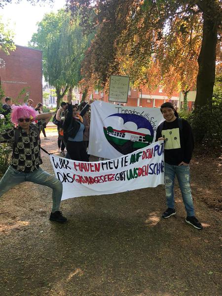 Eine etwas andere Idee hatten die Schülerinnen und Schüler der KAF 18a, AVB, der AVM und der BIK-DAZ 18a – eine Demonstration zum Grundgesetz. Gemeinsam ging es vom Schulgebäude in der Holstenstraße über den Kleinflecken bis zum Großflecken. Unter dem Motto „70 Jahre Grundgesetz – auf weitere 70 Jahre“ ging es von 10:00 bis 12:00 Uhr tanzend und demonstrierend durch die Stadt.