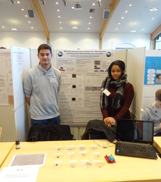 „Nanostrukturierung metallischer Oberflächen“ - so lautet der Titel des Forschungsprojektes, mit dem die Schülerin Kimberly Ehondor und der Schüler Nico Burgemeister am Jugend forscht – Regionalwettbewerb teilgenommen haben. Mit einer sehr ansprechenden Präsentation haben sie es am 23.02.2018 in Elmshorn geschafft, die Jury von ihrem Projekt zu überzeugen und wurden aus diesem Grund beim Regionalwettbewerb in der Sparte Chemie als bestes Projekt ausgezeichnet.