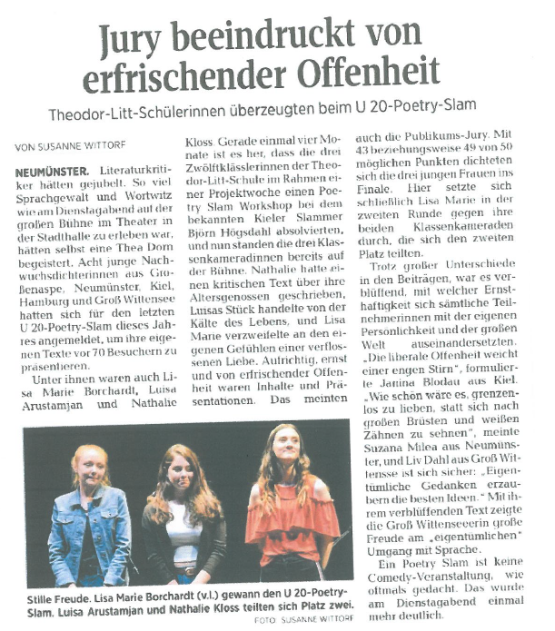 Am 22.05. sicherten sich drei Schülerinnen aus der 12. Klasse des Beruflichen Gymnasiums alle Plätze im Finale des letzten diesjährigen U 20-Poetry-Slams im Theater in der Stadthalle. Vom Publikum zur Siegerin wurde Lisa-Marie Borchert gekürt, Nathalie Kloss und Luisa Arustamjan teilten sich den zweiten Platz.