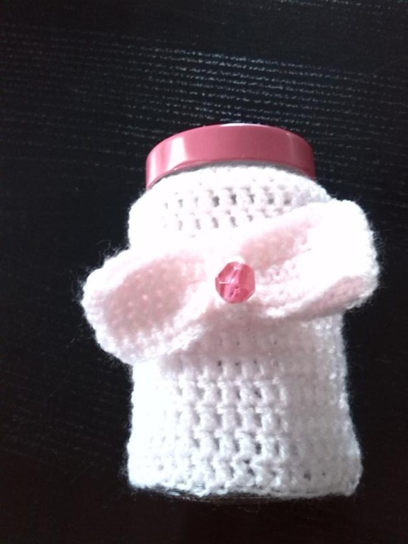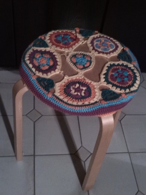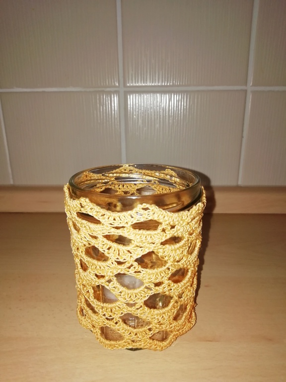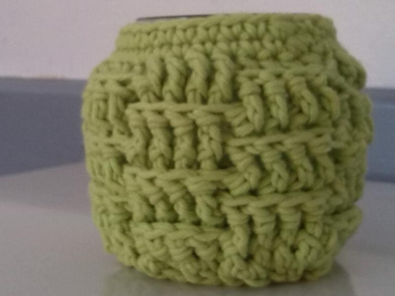 Auch Ungeübte können sehr schnell aus einem Marmeladenglas einen Stiftebecher (Bild 1) für den Schreibtisch herstellen. Fortgeschrittene können für innen und außen Windlichter (Bild 2) zaubern, einen Hocker mit hässlicher Oberfläche bunt behäkeln (Bild 3) oder das Lieblingsshirt, mit dem blöden Soßenfleck, bekommt ein Häkelornament und sieht damit individuell und gut aus.